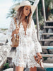 Produktdetails: Weisses Bohemian Strand Kleid mit Spitzen. Langarm Sommerkleid mit Cut-Outs und schönen Spitzen. V-Ausschnitt Damenkleid.