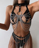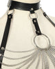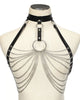 Produktdetails: Schwarzer Körpergürtel Harness mit silbernen Ketten unten um die Brust herum und Choker Kette für um den Hals. Festival Accessoire kann mit Kleidung oder Dessous getragen werden. Einstellbarer Harness Fetisch Style Körpergürtel für alle Grössen.