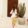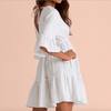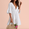Produktdetails: Weisses Strand Sommer Kleid mit Ausschnitt und zum Binden auf der Rückseite.