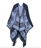 Produktdetails: Asymmetrischer Poncho Schal / Umhang. Poncho Cape im Vintage Retro Look mit Blumen und Ethno Symbolen.